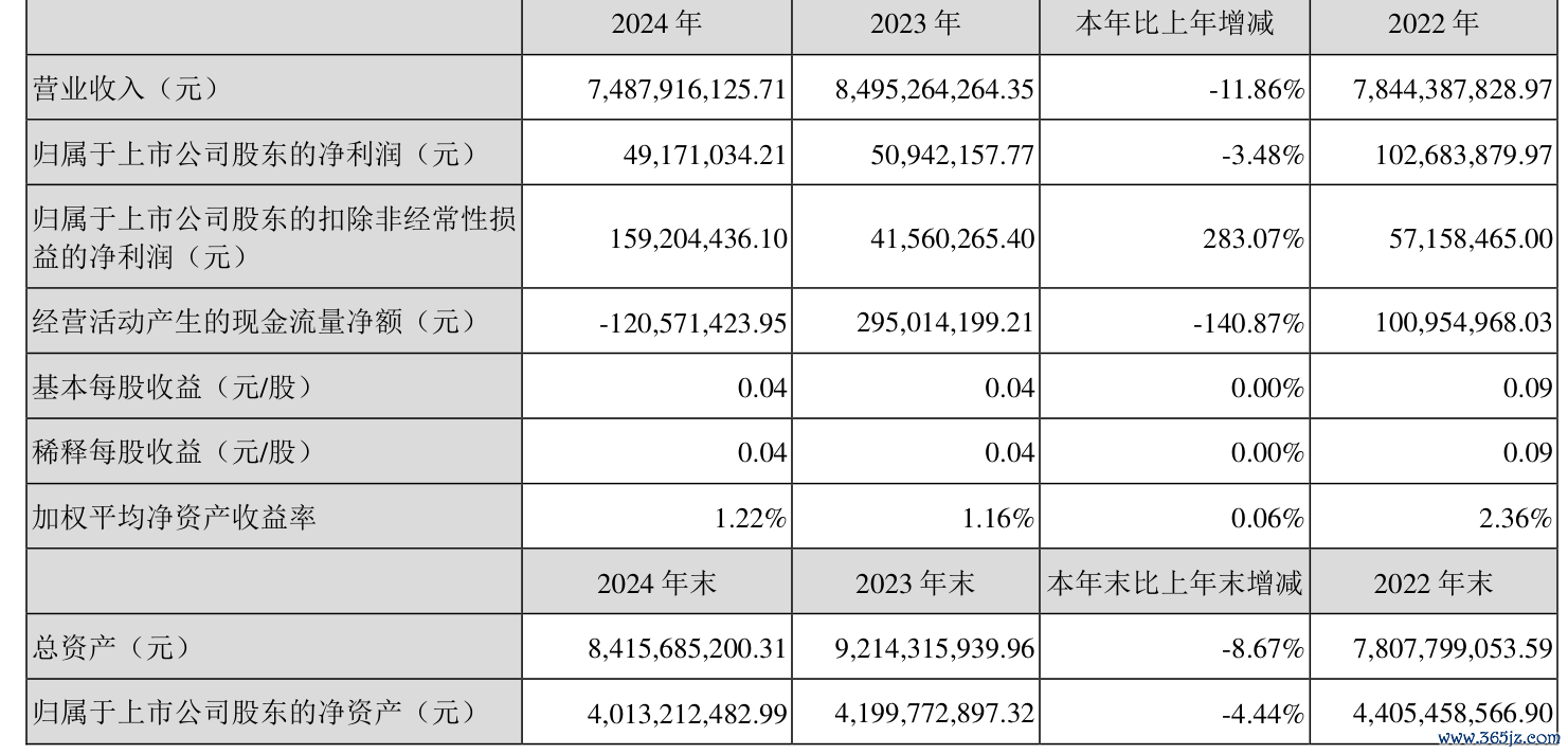 中证智能财讯海联金汇(002537)4月26日披露2024年年度报告。2024年,公司实现营业总收入74.88亿元,同比下降11.86%;归母净利润4917.1万元,同比下降3.48%;扣非净利润1.59亿元,同比增长283.07%;经营活动产生的现金流量净额为-1.21亿元,上年同期为2.95亿元;报告期内,海联金汇基本每股收益为0.04元,加权平均净资产收益率为1.22%。