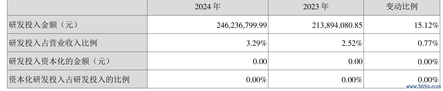 2024年全年,公司研发投入金额为2.46亿元,同比增长15.12%;研发投入占营业收入比例为3.29%,相比上年同期上升0.77个百分点。此外,公司全年研发投入资本化率为0%。