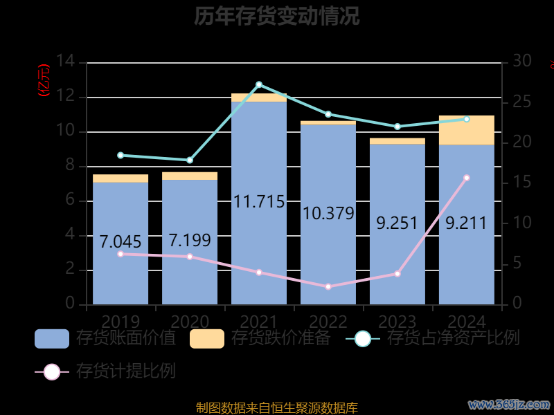 从存货变动来看,截至2024年末,公司存货账面价值为9.21亿元,占净资产的22.95%,较上年末减少401.31万元。其中,存货跌价准备为1.71亿元,计提比例为15.68%。