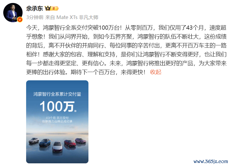 余承东:鸿蒙智行全系交付突破100万台余承东:鸿蒙智行全系交付突破100万台