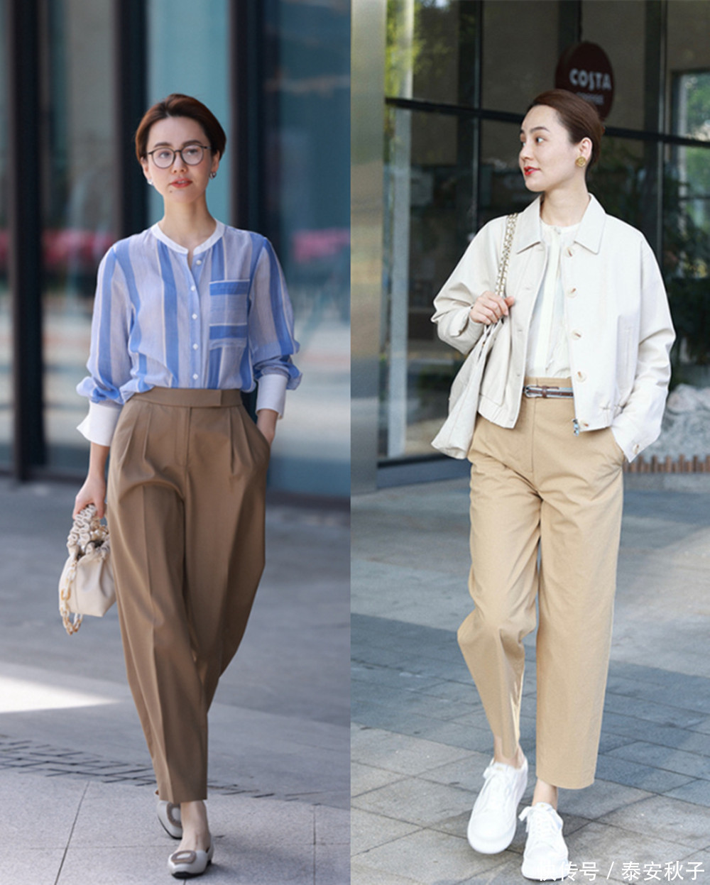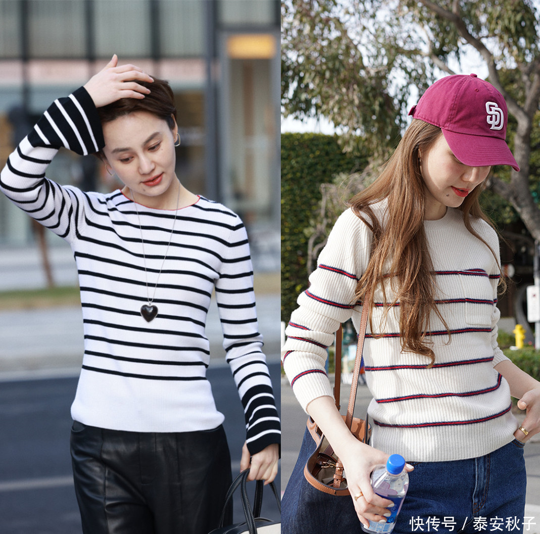 春季出门时,美女博主会选用配色清爽、色彩更醒目的条纹衫,与高腰修身裤的组合,营造出刚毅中带着酷飒,格外拉风的既视感。