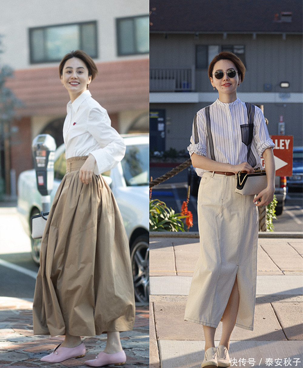 春日里的浅咖色半裙,也是基础单品。